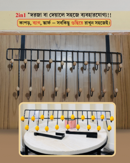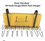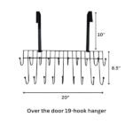 Over The Door 19-Hook Hanger Product type : Hanger Width: 20 inches Height (including door hooks): 18.5 inches (10" for hooks + 8.5" for the hanging section) Hanging Section Height: 8.5 inches Door Hook Height: 10 inches Designed to hang over the top of a standard door. Made of durable metal with a sleek black finish. Features 19 hooks in total, organized in two rows for efficient storage. Ideal for hanging coats, hats, bags, scarves, towels, and more. No tools or drilling required—simply place over the door for instant use. Color: As picture given