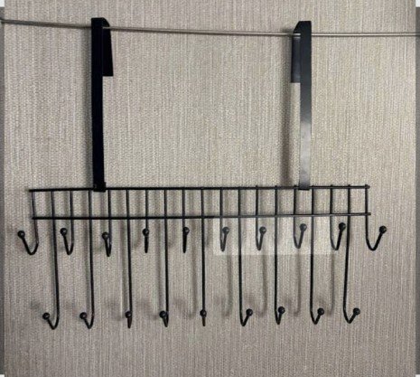 Over The Door 19-Hook Hanger Product type : Hanger Width: 20 inches Height (including door hooks): 18.5 inches (10" for hooks + 8.5" for the hanging section) Hanging Section Height: 8.5 inches Door Hook Height: 10 inches Designed to hang over the top of a standard door. Made of durable metal with a sleek black finish. Features 19 hooks in total, organized in two rows for efficient storage. Ideal for hanging coats, hats, bags, scarves, towels, and more. No tools or drilling required—simply place over the door for instant use. Color: As picture given