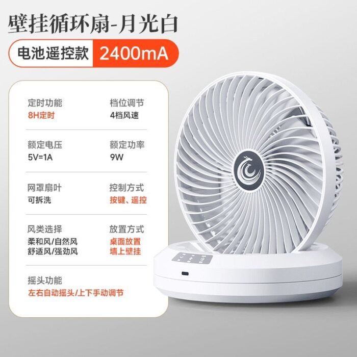 Power Supply Mode: USB Operation Mode: Ordinary Button Type: Remote Control Color: White & Golden Built-in Battery: Built-In 2400mah Battery Function: 120° Rotate Timing Wind Power: 4 adjustable gears Motor Type: Brushless Motor Number Of Fan Blades: 3 Pieces Shell Process: Electroplating Fan Classification: USB Fan Product Net Weight: 630g Appearance Size: 20*20*23cm Timing Function: 2-7.5 hours